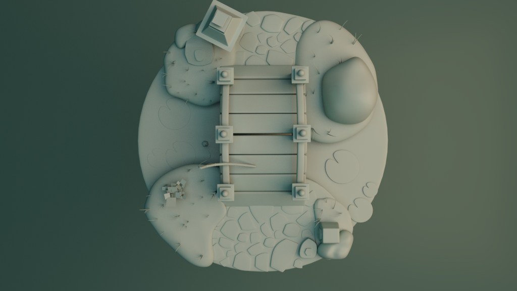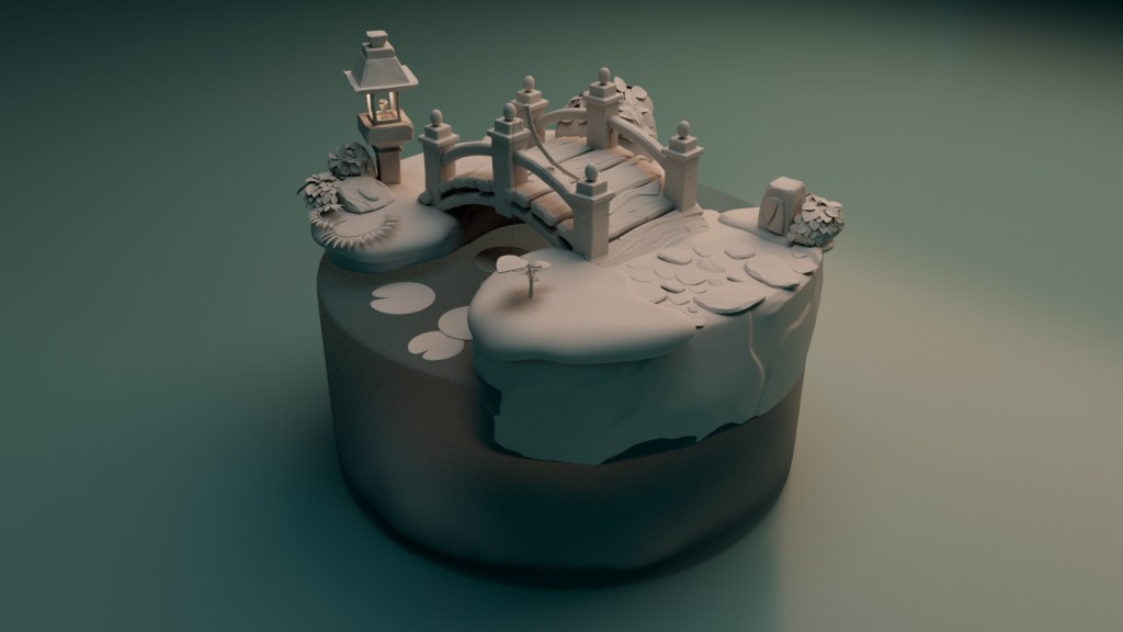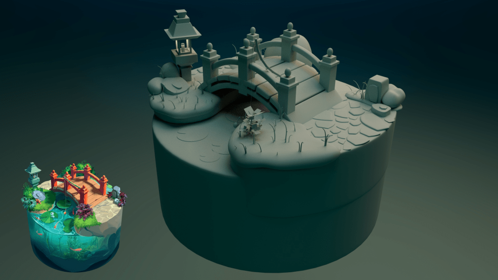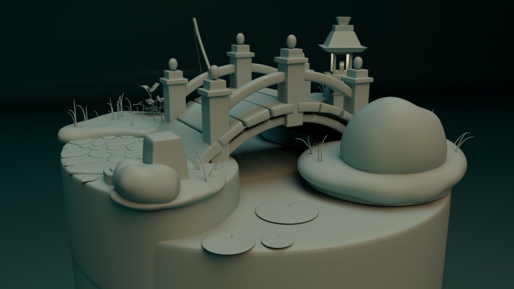 For the lighting and rendering, once the texturing is finished, the base lighting will be done in Unreal. The water shader for the pond, as well as some lighting effects using Niagara for the candle flames and particles for a firefly swarm effect, will also be created in Unreal.